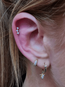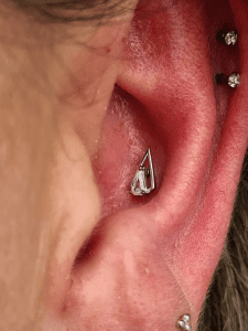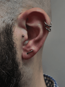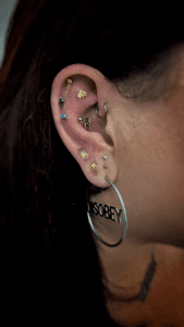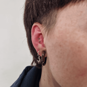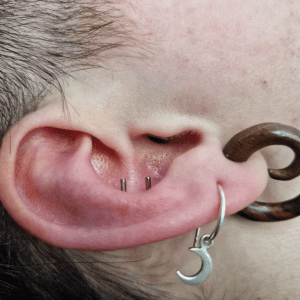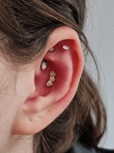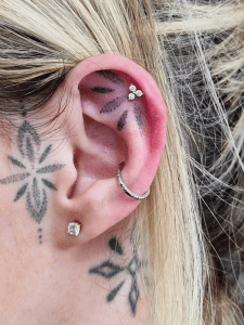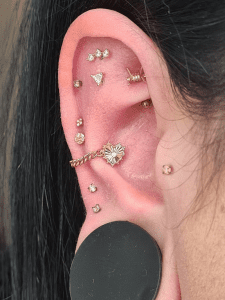 This absolutely amazing ear curation was all pierced and styled by myself over the space of a couple of years. It is all 14kt white gold and the jewellery is by Buddha organics and Junipurr Jewellery there is stacked lobes, a daith an upper lobe and a rook here