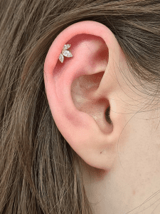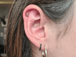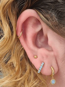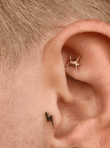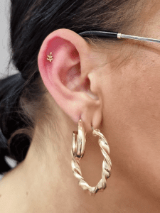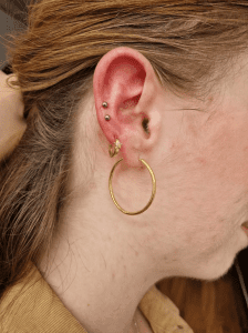 Conch piercing performed by Jane at Eternal Gold in Glasgow with a 14kt yellow gold pice by Buddha Organics. There is also a second lobe there also performed by Jane using Buddha Organics