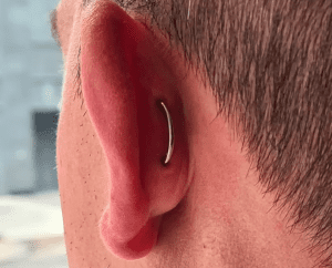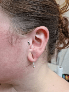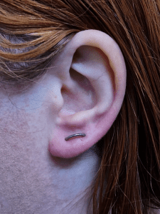 Upper lobe piercing performed by Jane at Eternal Gold in Glasgow with an implant grade titanium pice of jewellery that has been anodised yellow