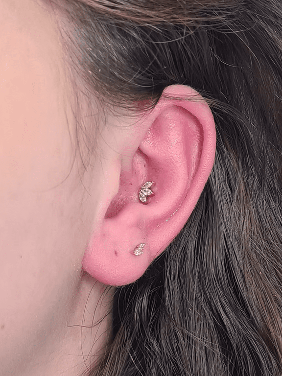 Conch piercing performed by Jane at Eternal Gold in Glasgow with a 14kt yellow gold pice by Buddha Organics. There is also a second lobe there also performed by Jane using Buddha Organics