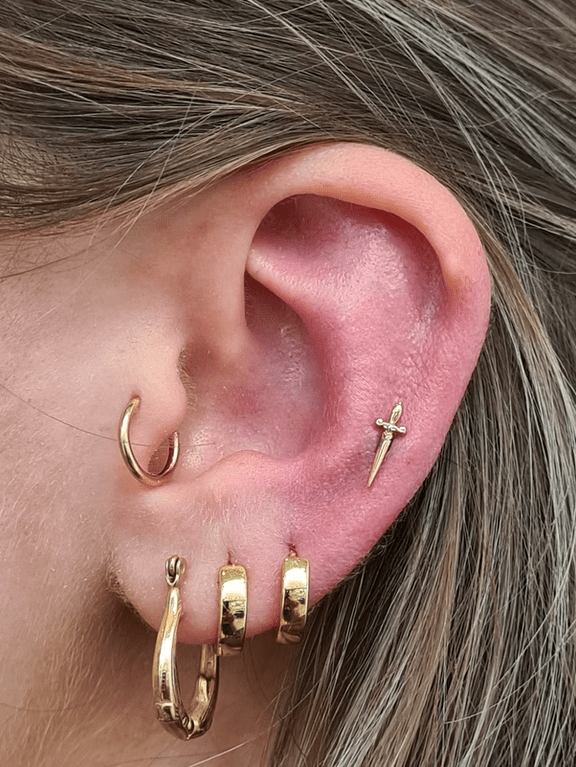 Helix piercing performed by Jane at Eternal Gold in Glasgow with a 14kt yellow gold dagger