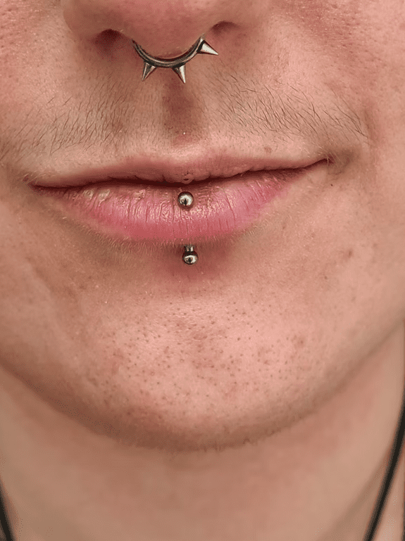 This is a vertical labret piercing done at Eternal Gold in Glasgow with implant grade titanium