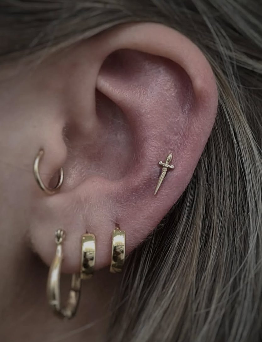 Get edgy with this finely detailed work of art! One of our most popular styles, Blade is a shining 14kt gold masterpiece with intricate detailing throughout. This piece looks fantastic in the tragus, lobe, and helix/flat and will slay all day.