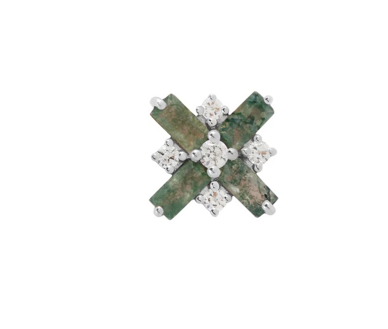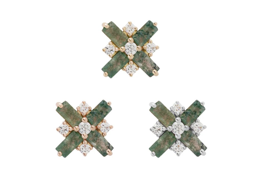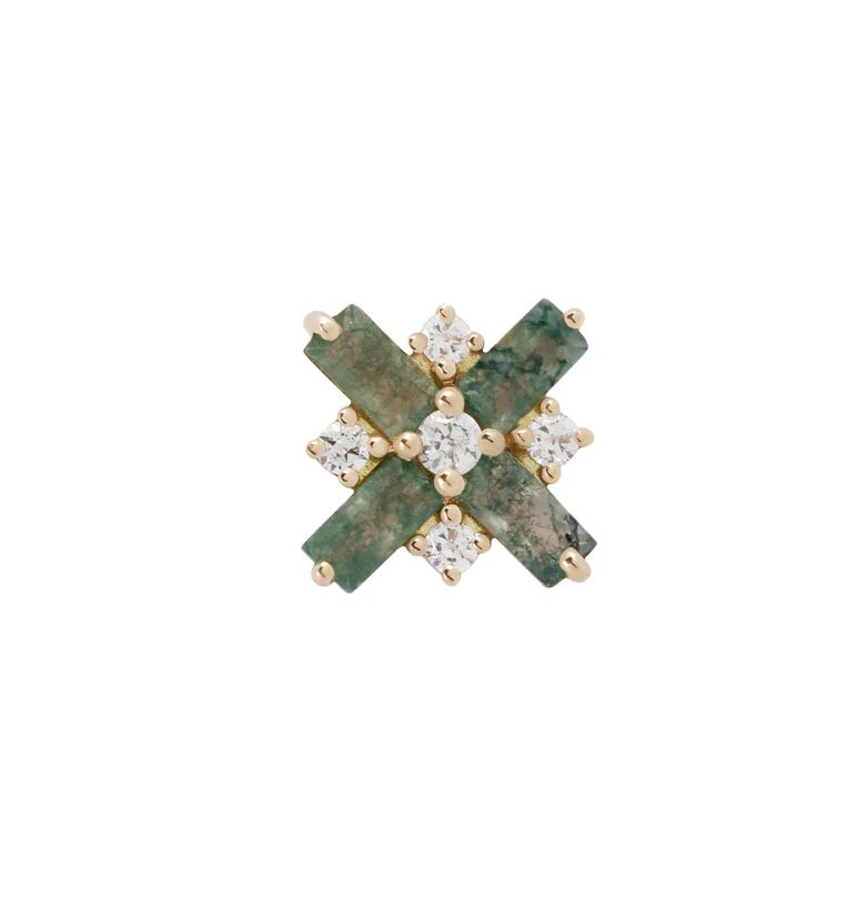 Covet is one of those pieces that stops you in your tracks. With four marquise-cut moss agate stones and five tiny white CZs nestled between them, it’s earthy, elegant and just the right amount of sparkly. Each moss agate is totally unique, full of those soft green inclusions that give it a calm, natural feel – like a tiny forest frozen in stone.