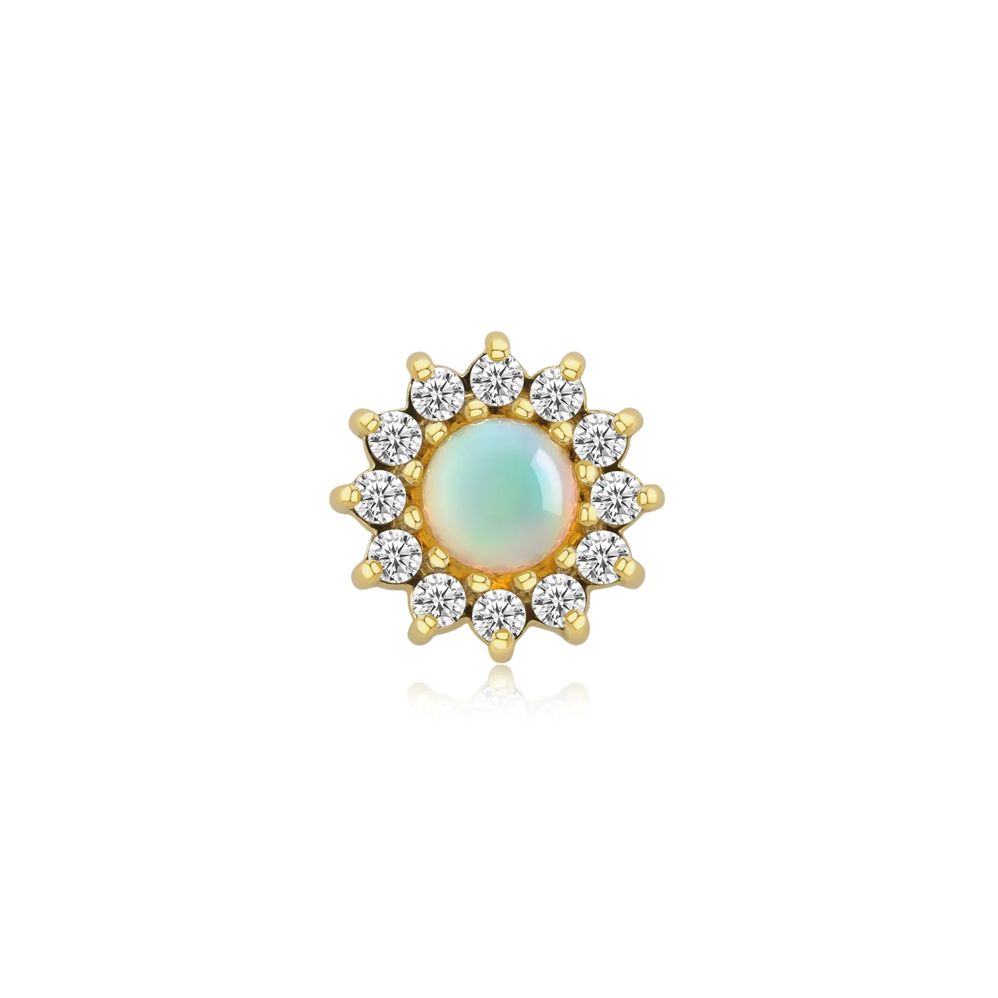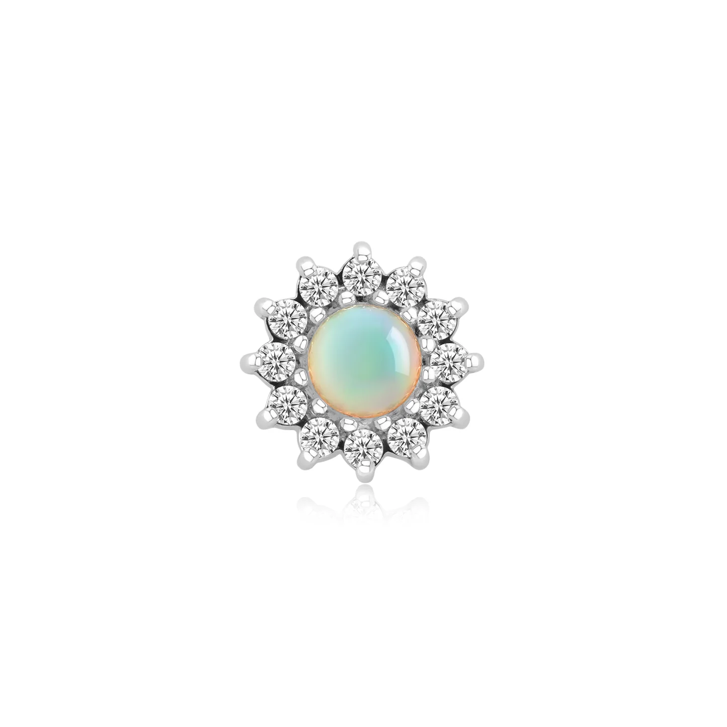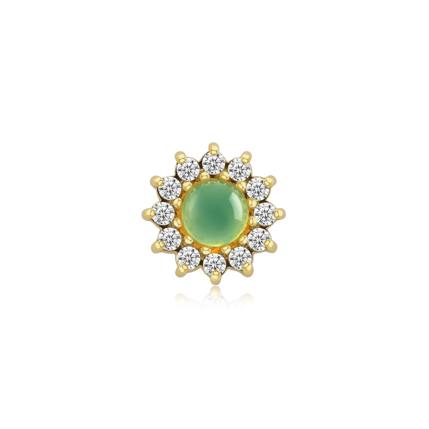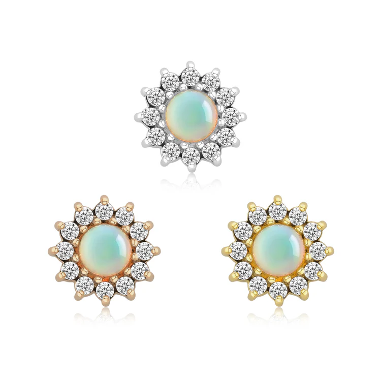 Meet your new radiant obsession! The Helia threadless end, a sunburst of genuine chrysoprase or natural white opal, crowned with sparkling CZs. Add a touch of cosmic brilliance to any look!