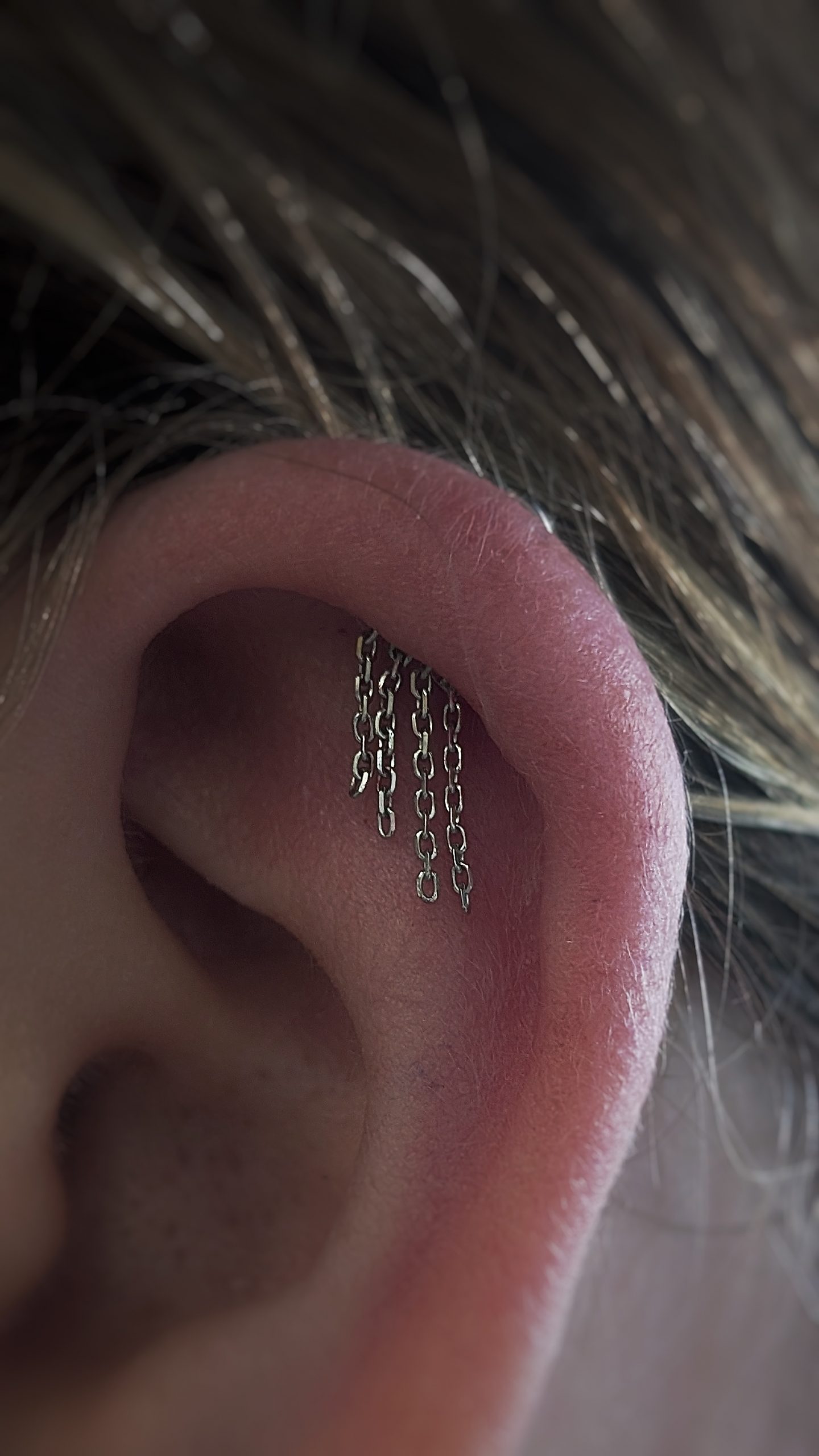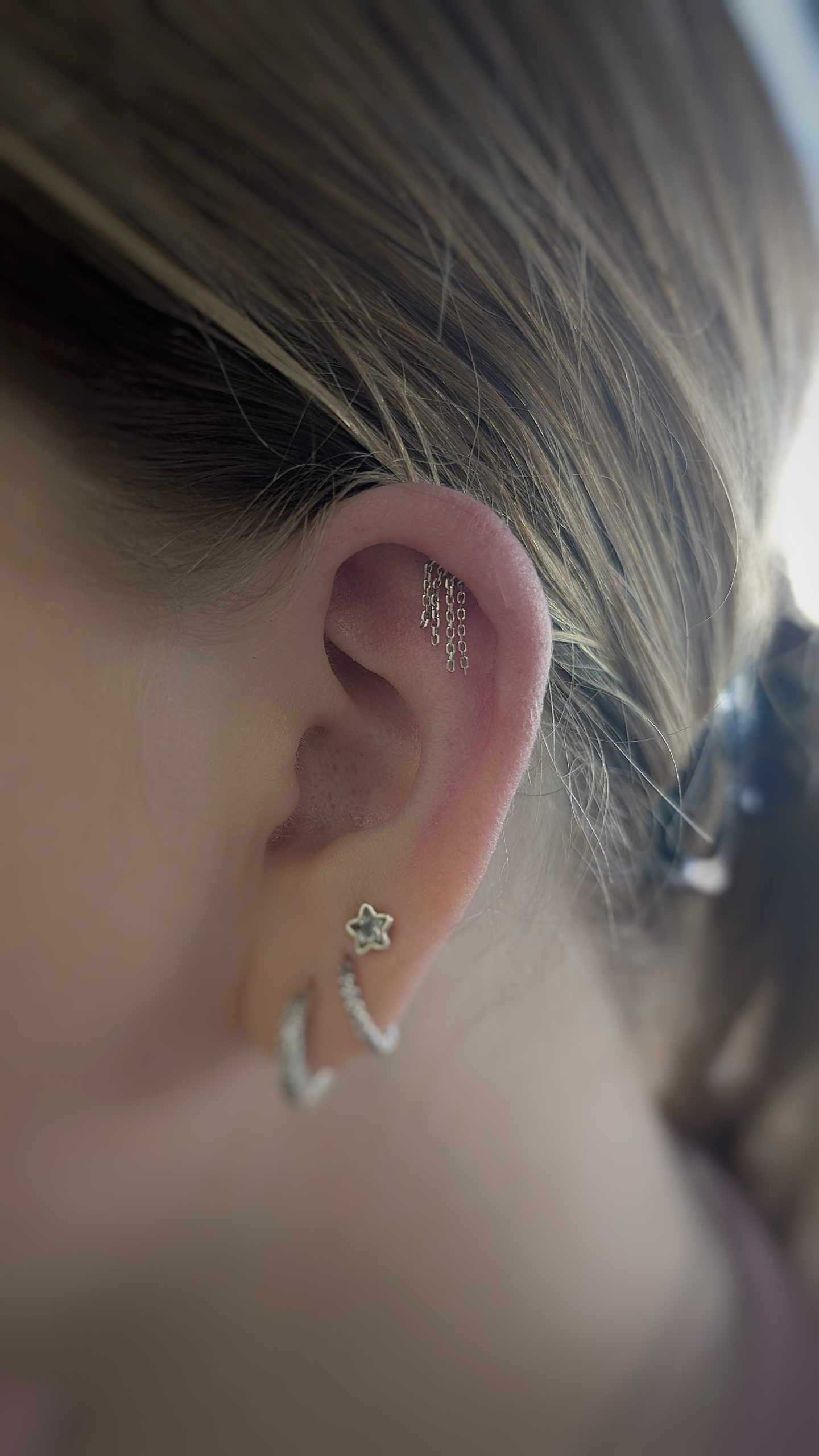 When subtlety meets sparkle, Imogen steals the show. This delicate white gold piece is perfect for adding a touch of elegance to your hidden helix. With its soft, shimmering chains and understated design, it brings just the right amount of glamour without being over the top.