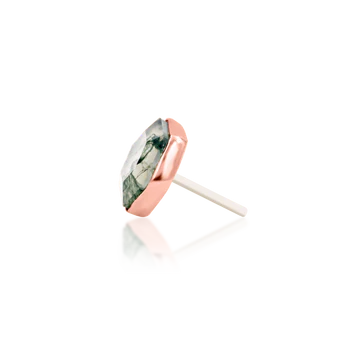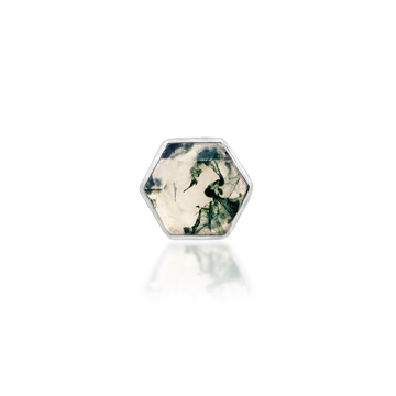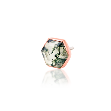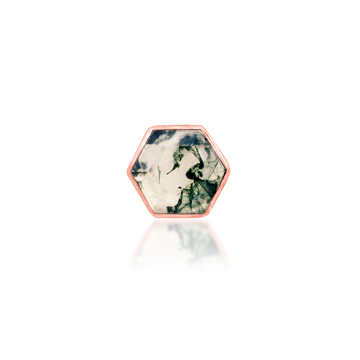 A breathtaking 4.5x4mm hexagon cut genuine moss agate stone wrapped in a 14kt gold frame.